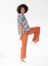With its loose raglan sleeves, flowy feel, and dahlia hand block print, this top is as joyful as frolicking through fields of florals. Rich with delicate details and unique touches: an asymmetrical hem, ladder trim at the cut seams, stylish gathering at the neckline, and a keyhole button closure.
