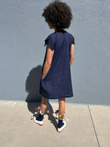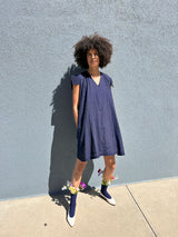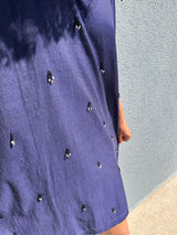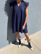 This shift mini dress is as effortless as it is elegant and fun. Featuring special sleeves, hidden side pockets and embellished with our festive night lights embroidery on rich navy handloom woven cotton. Fully lined.
