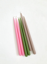 Illuminate your table with this set of 2 tall taper candles. Made from a quality blend of waxes and beautiful dyes, these candles are artfully hand dipped using old techniques by Danica Candles in Maine. Long-burning, unscented, solid color.