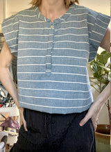 A new top, sort of by accident! I took the previous Sukie dresses and turned them into tops + aprons instead because that felt right to me. Slightly cropped and boxy in a soft but structured handloom woven recycled cotton twill. This is a special spin on our fan favorite and best selling Kerry top.