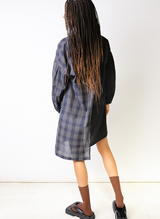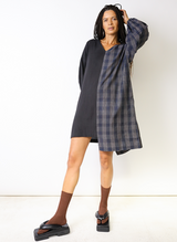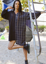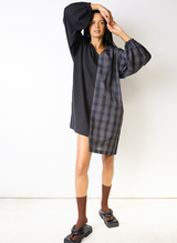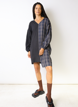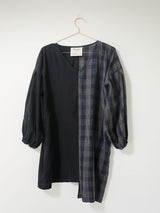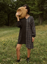 A chic shift dress with some extra special details: black + plaid color blocking, streamlined puff sleeves, an asymmetrical hem, and an elegant v-neckline. Made of cotton handloomed from naturally dyed sapphire and black yarn. Fully lined, with convenient side pockets.