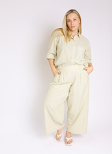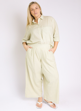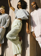 Total comfort meets tailored detailing in the Novel Pants. Featuring a mid-high rise with an elastic back waistband, plus a button closure at the side and flattering pleating at the front. Lightweight organic cotton fabric leads to elegant draping, and the back welt pocket adds a bespoke touch. All in a chic and bright matcha stripe.