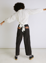 An effortlessly chic wrap shirt, crafted from handloom woven organic cotton poplin. In a crisp white with elegant contrast stitching. Features a v neckline with a hidden snap closure, a subtle puff sleeve with elastic cuffs, and a functional wrap design that ties at the back waist.