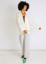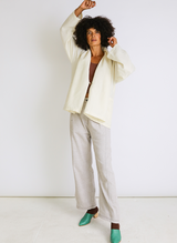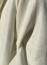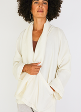 The easiest cardigan meets the comfiest scarf. Crafted from a cozy handloom woven cotton-wool blend in natural off-white, the double-layered Scarf Cardi feels like wrapping yourself in a blanket. Features a scarf-like collar that drapes down the front, with a small single button closure. And pockets, of course. Relaxed and roomy enough to layer over tops, light enough to layer under jackets.