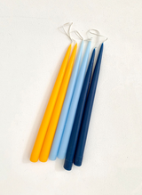 Illuminate your table with this set of 2 tall taper candles. Made from a quality blend of waxes and beautiful dyes, these candles are artfully hand dipped using old techniques by Danica Candles in Maine. Long-burning, unscented, solid color.